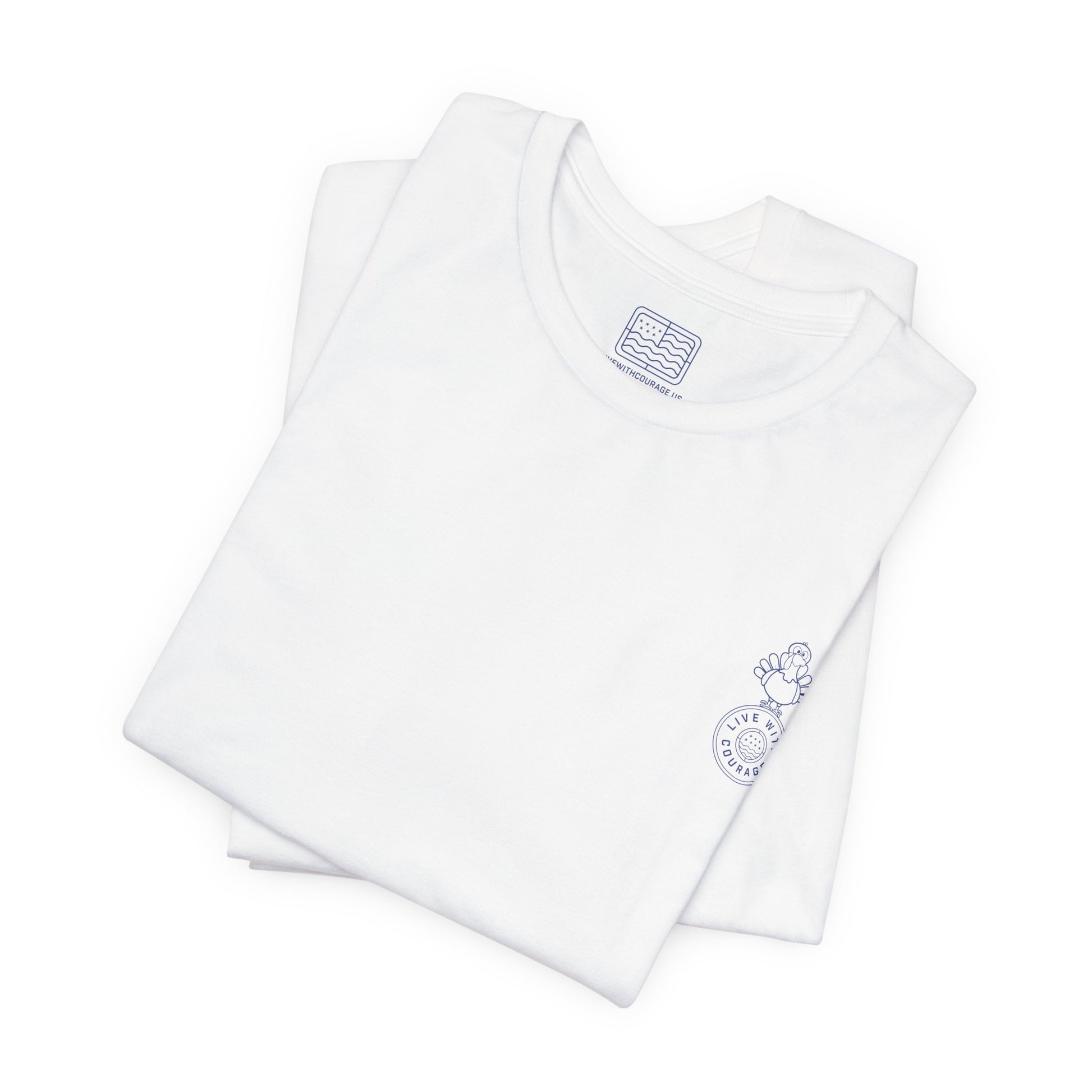 Our Courage Turkey Tee features a fun, one-of-a-kind graphic: a cartoon turkey boldly standing between two eagles, under the motto “Fortune Favors the Bold.” It’s a lighthearted reminder that courage comes in all forms — and sometimes, it gobbles.