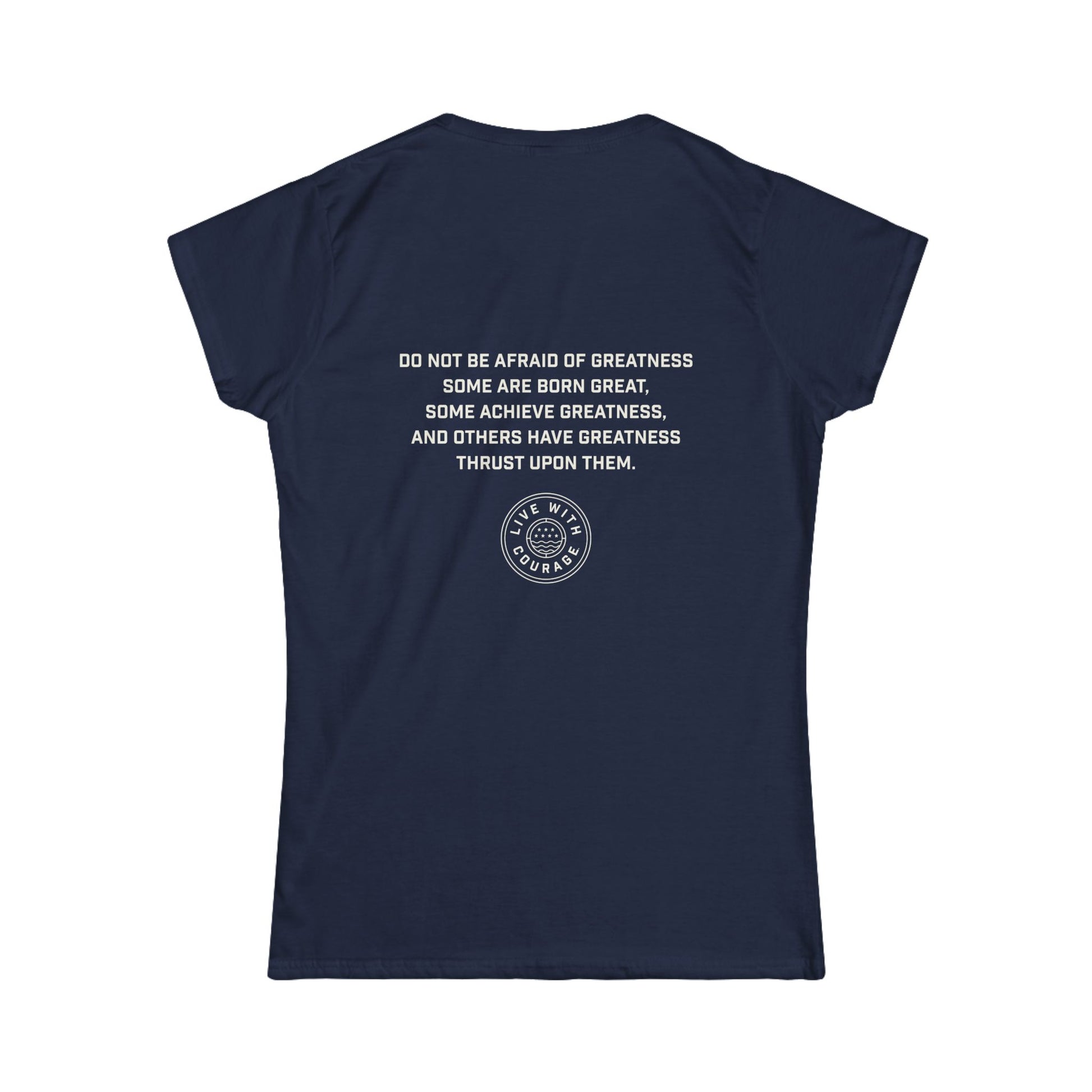 This premium women's softstyle tee features the powerful message "Do Not Fear Greatness" on the front, with Shakespeare's timeless quote on the back: "Do not be afraid of greatness. Some are born great, some achieve greatness, and others have greatness thrust upon them."