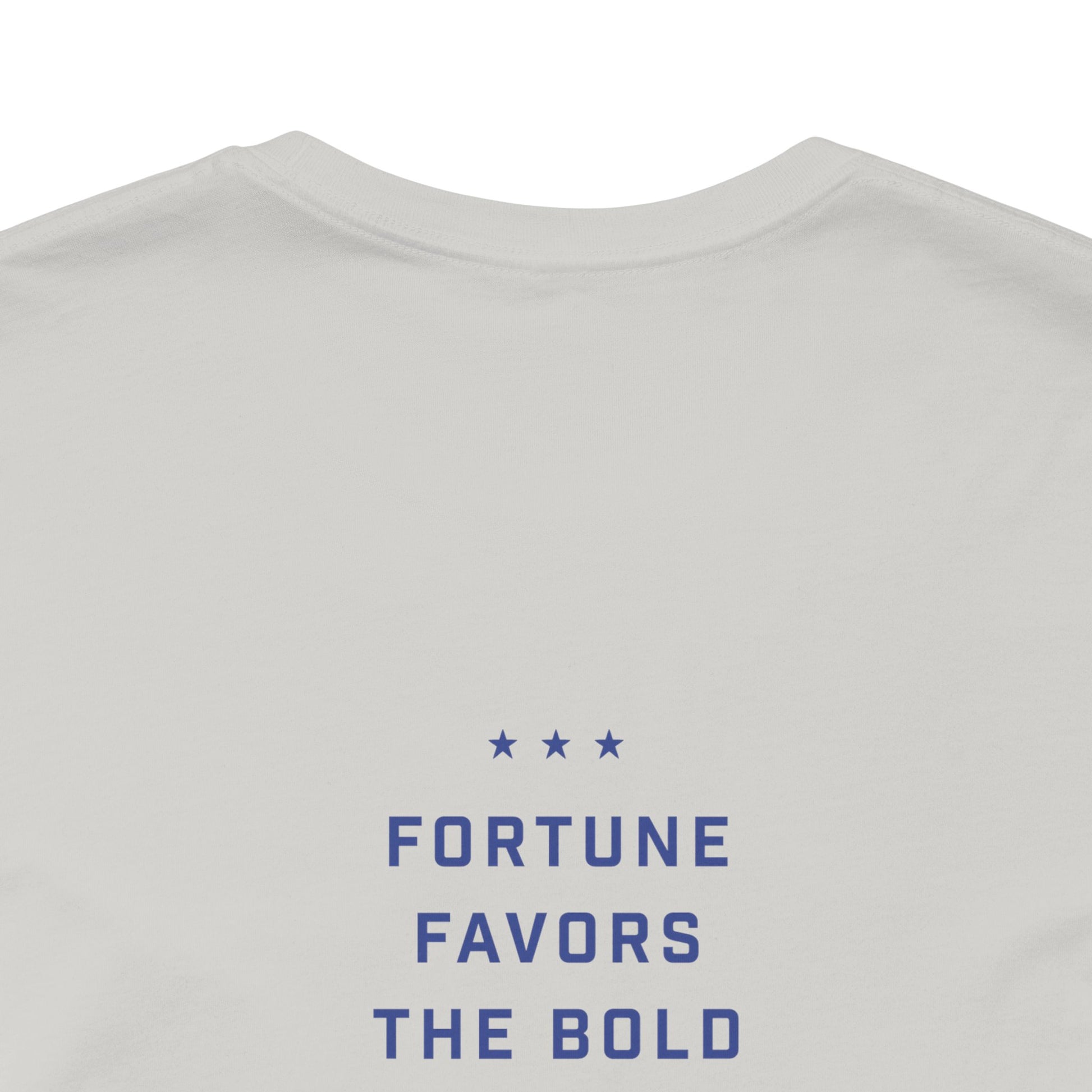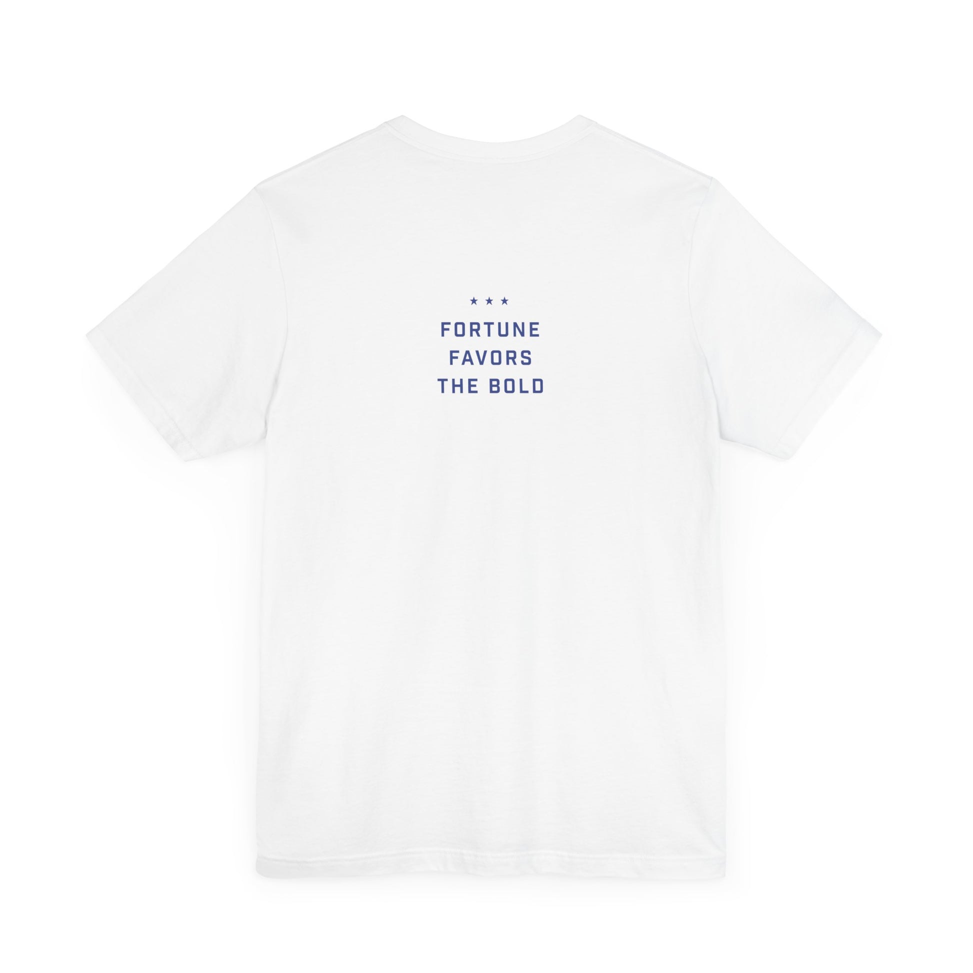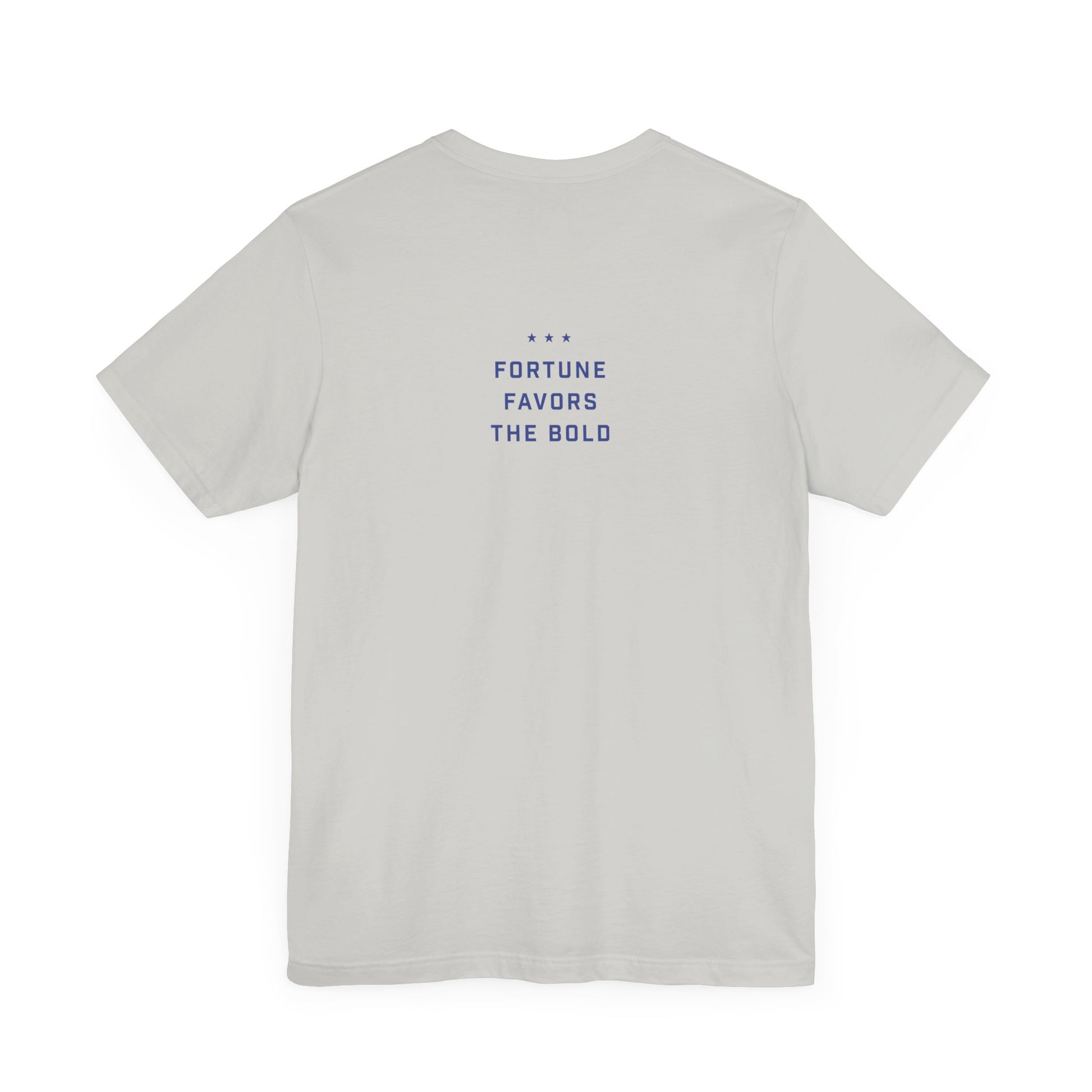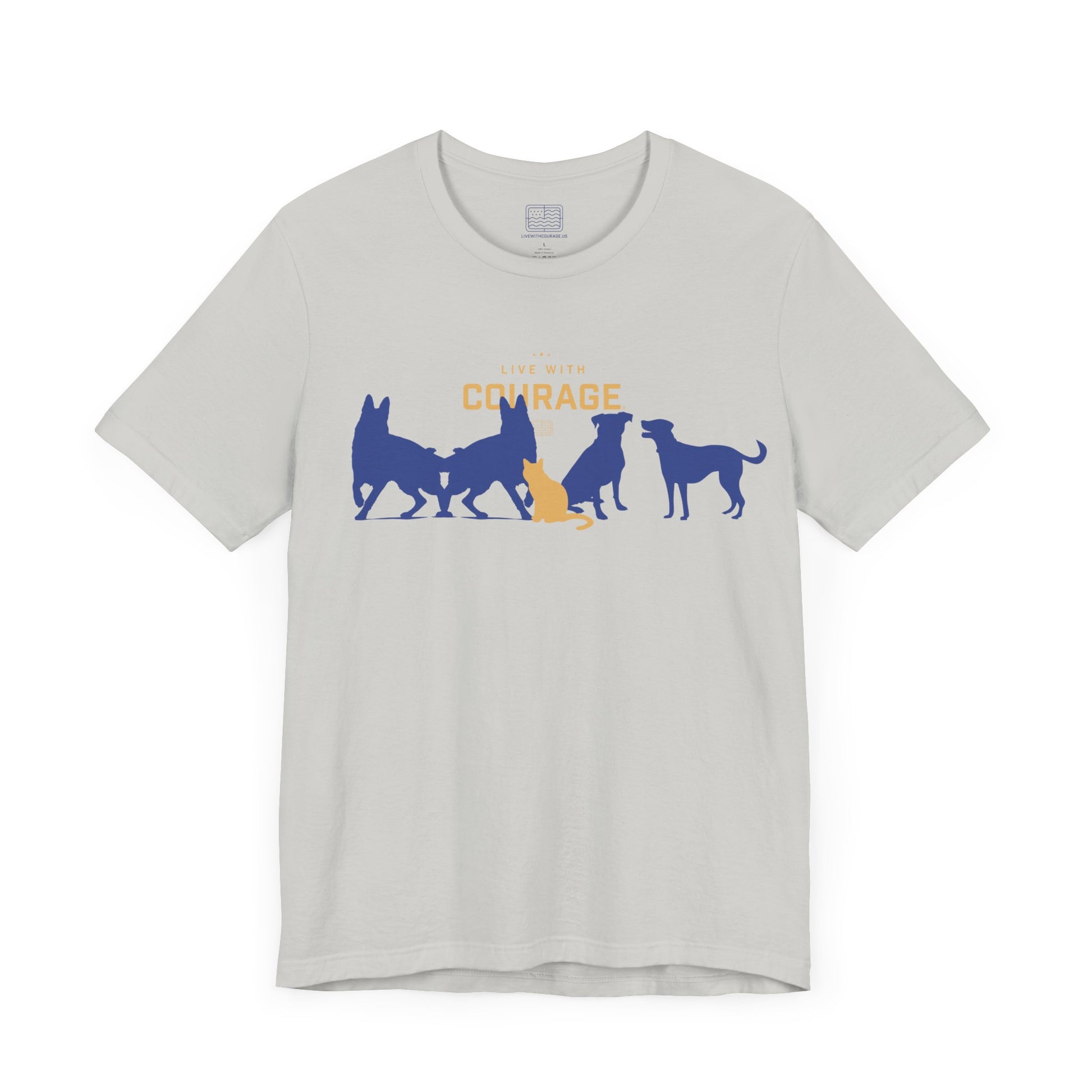 Meet our Dogs and Cat Unisex Jersey Short Sleeve Tee - a fun and quirky addition to your wardrobe. This 100% Airlume combed and ring-spun cotton tee features a playful design of a fearless cat hanging out with big dogs. It's all about attitude and confidence, making it a perfect fit for those who love to stand out. The back of the tee showcases our three stars and the motto 'Fortune Favors the Bold.'