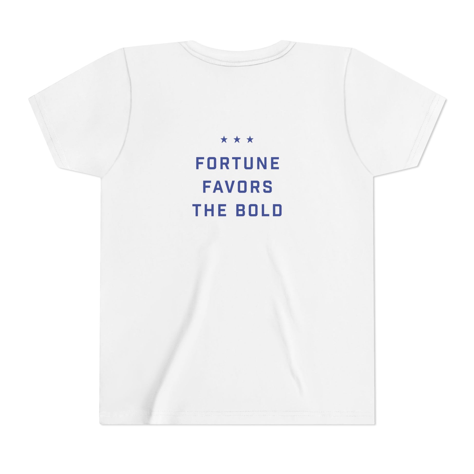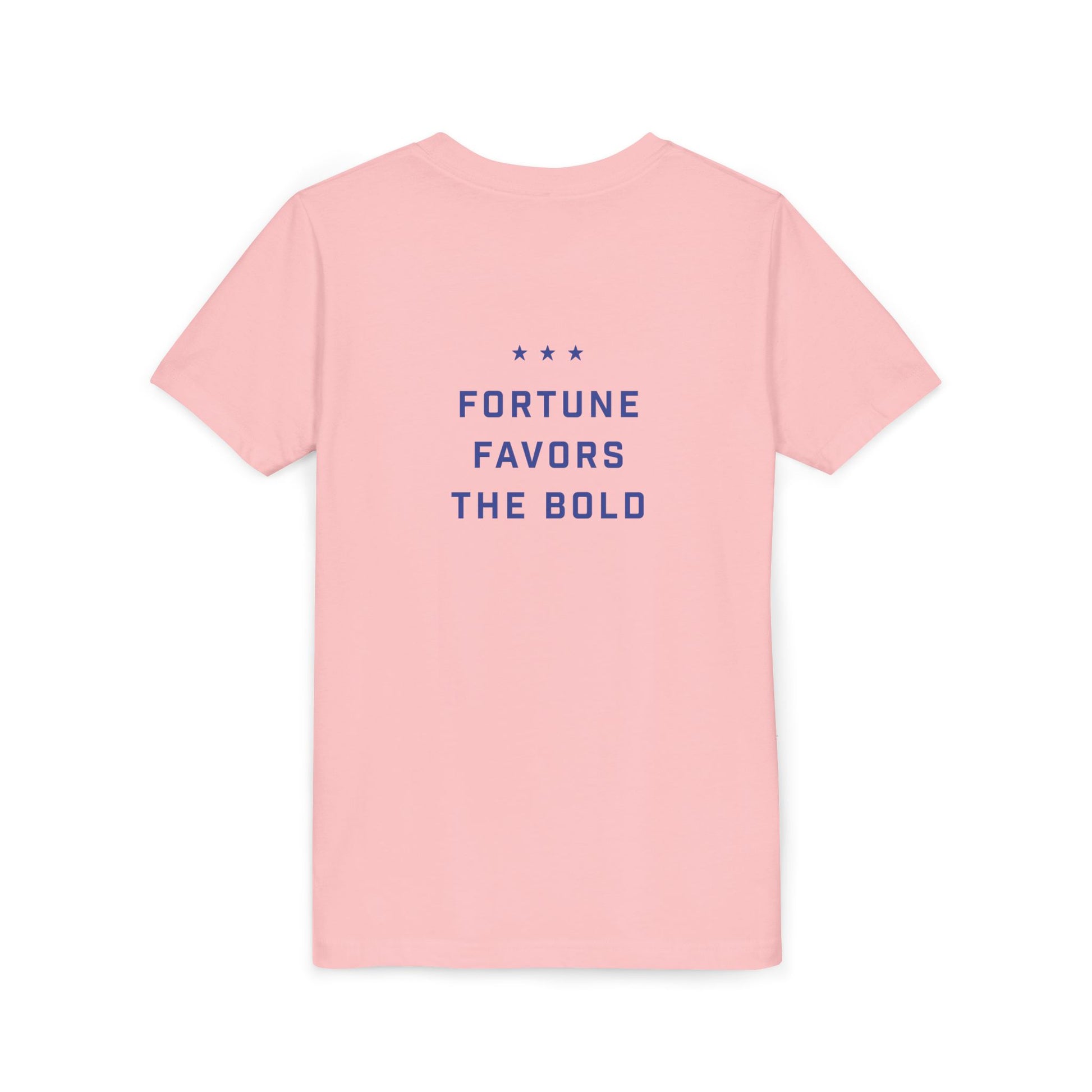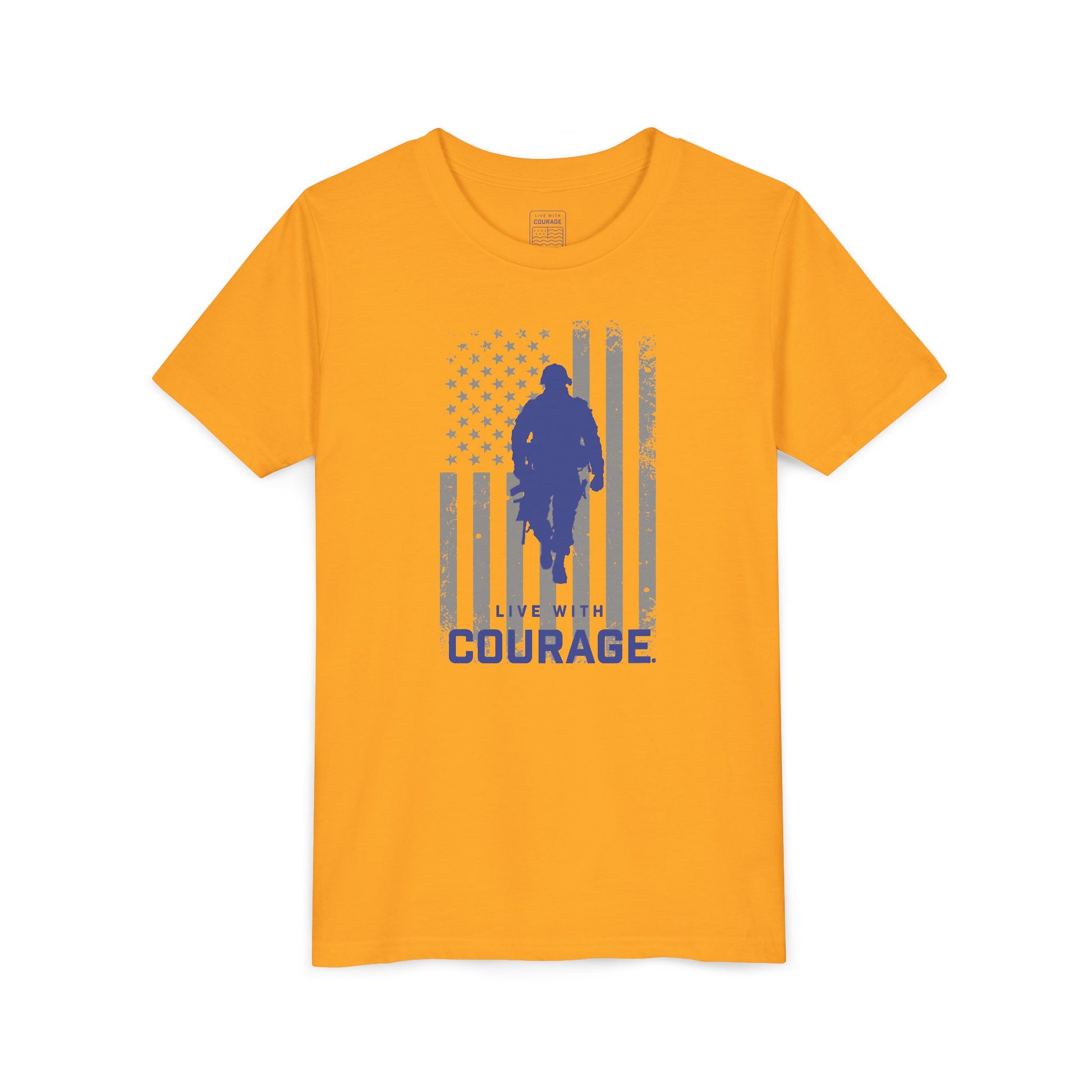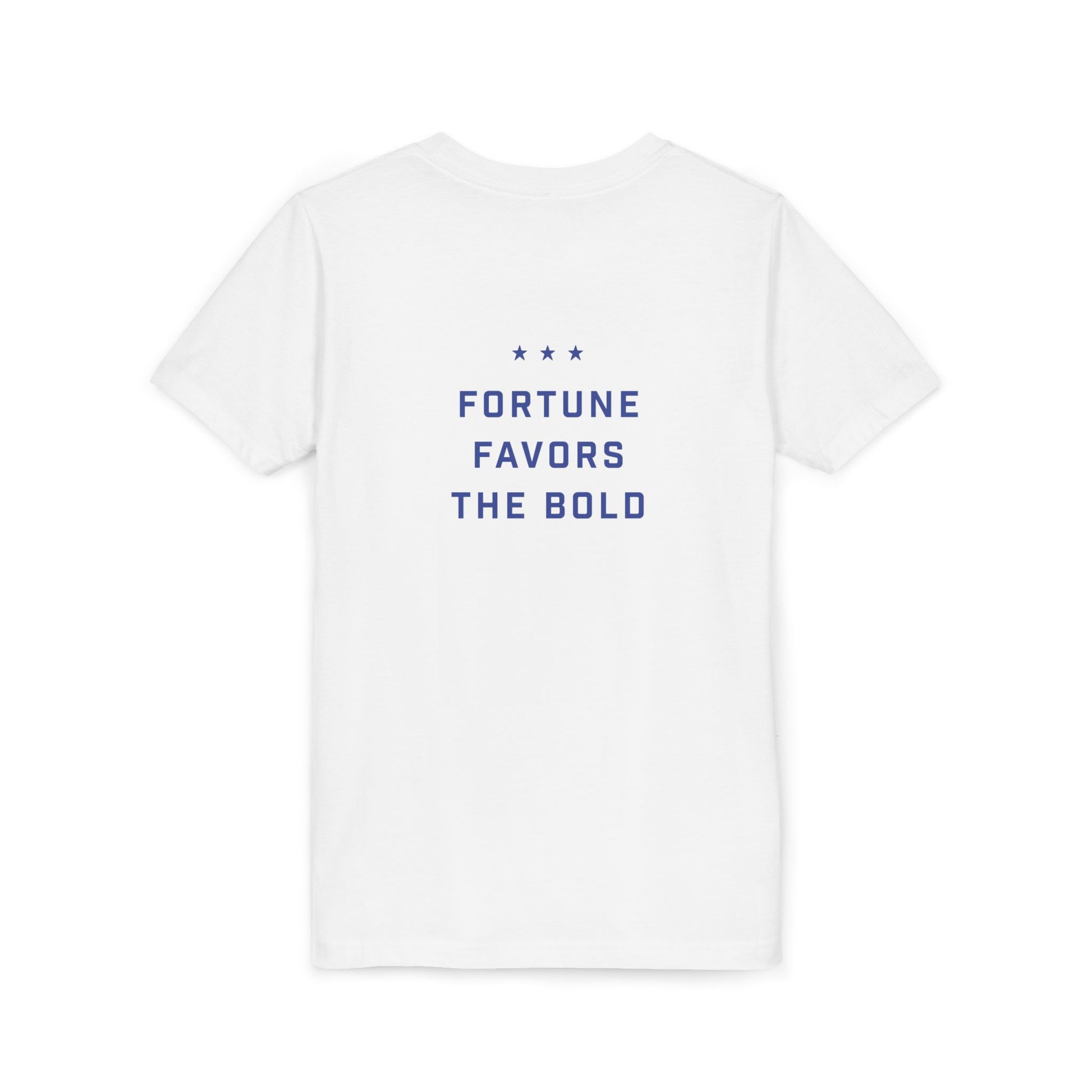 This premium youth shirt is perfect for young patriots who want to show their support for military families. Featuring the iconic Old Glory flag and our signature Live With Courage® logo on the front, plus our powerful "Fortune Favors the Bold" message on the back.